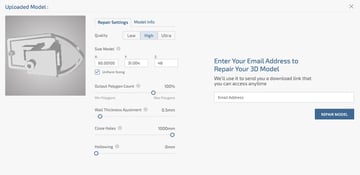 Just upload your 3D file select one of the tools to make fixes and your 3D file is ready to print. To learn more about the 3D model repair algorithm and test it out quickly go to the 3D Model Repair service. Features faster repair times thanks to new servers.